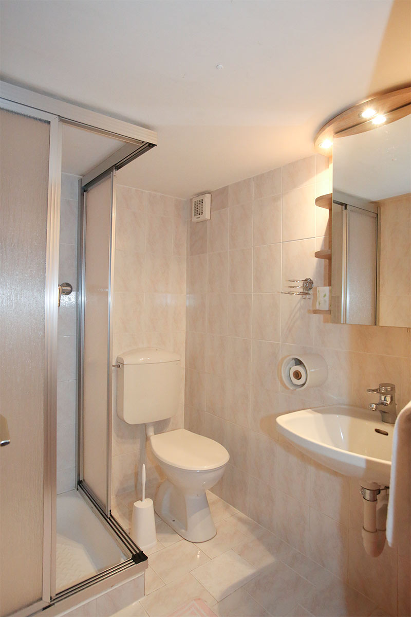Holzgetäfeltes Dreibettzimmer mit D/WC und Seeblick
